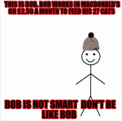 This is Bob. Bob works in MacDonald's on £2.50 a month to feed his 27 cats