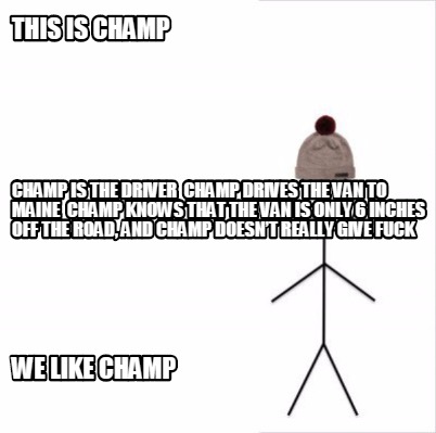 Champ Is the Driver Champ drives the Van to Maine Champ knows that the van is only 6 inches off the road, And Champ doesn’t really give fuck