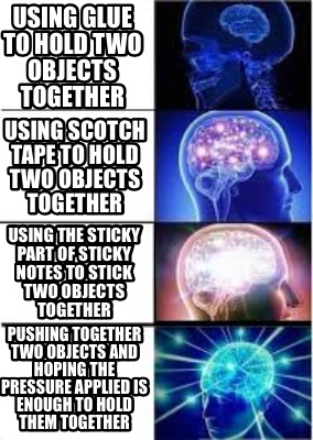 Pushing together two objects and hoping the pressure applied is enough to hold them together
