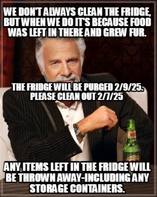 THE FRIDGE WILL BE PURGED 2/9/25. PLEASE CLEAN OUT 2/7/25