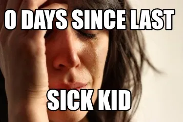 Make your own "0 Days since last Sick kid" meme with MemeCreator's free online meme generator. Add text, stickers, and drawings — then download or share. No watermark, no sign-up required.