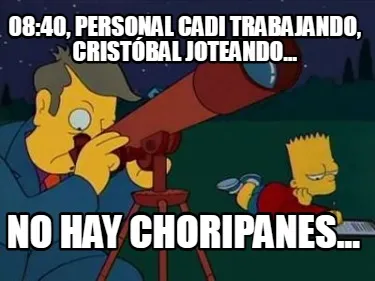 Make your own "08:40, personal CADI trabajando, Cristóbal joteando... No hay choripanes..." meme with MemeCreator's free online meme generator. Add text, stickers, and drawings — then download or share. No watermark, no sign-up required.