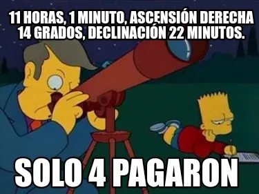 Make your own "11 horas, 1 minuto, ascensión derecha 14 grados, declinación 22 minutos. Solo" meme with MemeCreator's free online meme generator. Add text, stickers, and drawings — then download or share. No watermark, no sign-up required.