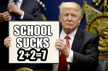 Make your own "Funny 2+2=7 School Sucks" meme with MemeCreator's free online meme generator. Add text, stickers, and drawings — then download or share. No watermark, no sign-up required.