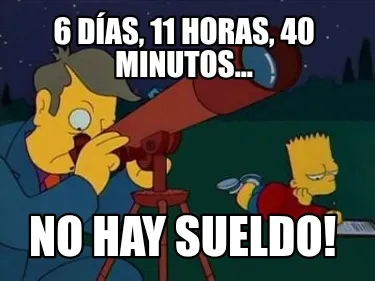 Make your own "6 días, 11 horas, 40 minutos... NO HAY SUELDO!" meme with MemeCreator's free online meme generator. Add text, stickers, and drawings — then download or share. No watermark, no sign-up required.