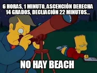 Make your own "6 horas, 1 minuto, ascención derecha 14 grados, decliación 22 minutos... No ha" meme with MemeCreator's free online meme generator. Add text, stickers, and drawings — then download or share. No watermark, no sign-up required.