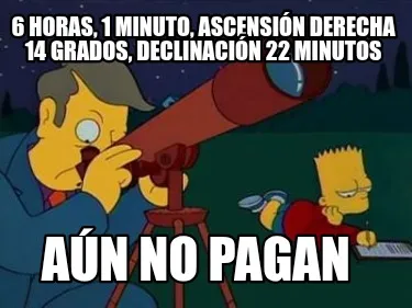 Make your own "Funny 6 HORAS, 1 MINUTO, ASCENSIÓN DERECHA 14 GRADOS, DECLINACIÓN 22 MINUTOS AÚN NO" meme with MemeCreator's free online meme generator. Add text, stickers, and drawings — then download or share. No watermark, no sign-up required.