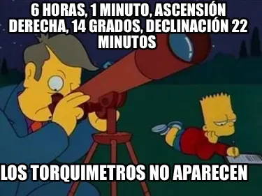 Make your own "Funny 6 horas, 1 minuto, ascensión derecha, 14 grados, declinación 22 minutos Los t" meme with MemeCreator's free online meme generator. Add text, stickers, and drawings — then download or share. No watermark, no sign-up required.