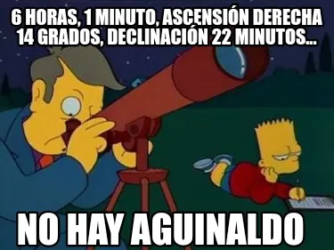 Make your own "6 HORAS, 1 MINUTO, ASCENSIÓN DERECHA 14 GRADOS, DECLINACIÓN 22 MINUTOS... No h" meme with MemeCreator's free online meme generator. Add text, stickers, and drawings — then download or share. No watermark, no sign-up required.