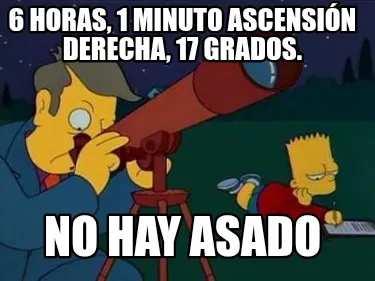 Make your own "6 horas, 1 minuto ascensión derecha, 17 grados. No hay asado" meme with MemeCreator's free online meme generator. Add text, stickers, and drawings — then download or share. No watermark, no sign-up required.