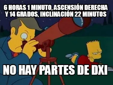 Make your own "Funny 6 horas 1 minuto, ascensión derecha y 14 grados, inclinación 22 minutos NO HAY" meme with MemeCreator's free online meme generator. Add text, stickers, and drawings — then download or share. No watermark, no sign-up required.