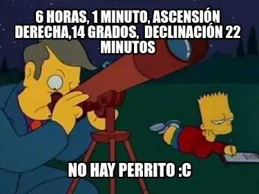 Make your own "Funny 6 horas, 1 minuto, ascensión derecha,14 grados, declinación 22 minutos No hay" meme with MemeCreator's free online meme generator. Add text, stickers, and drawings — then download or share. No watermark, no sign-up required.