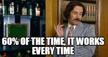 Make your own "60% of the time, it works every time" meme with MemeCreator's free online meme generator. Add text, stickers, and drawings — then download or share. No watermark, no sign-up required.