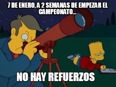 Make your own "7 de enero, a 2 semanas de empezar el campeonato... No hay refuerzos" meme with MemeCreator's free online meme generator. Add text, stickers, and drawings — then download or share. No watermark, no sign-up required.