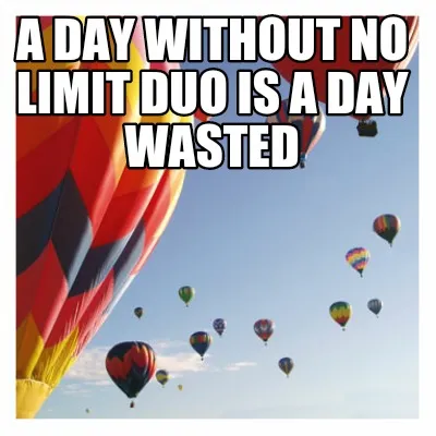 Make your own "Funny A DAY WITHOUT NO LIMIT DUO IS A DAY WASTED" meme with MemeCreator's free online meme generator. Add text, stickers, and drawings — then download or share. No watermark, no sign-up required.