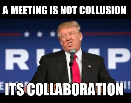 Make your own "Funny a meeting is not collusion its collaboration" meme with MemeCreator's free online meme generator. Add text, stickers, and drawings — then download or share. No watermark, no sign-up required.