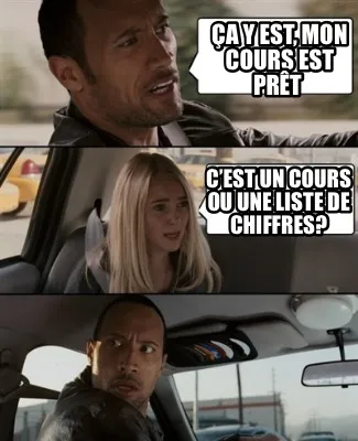 Make your own "Ça y est, mon cours est prêt c’est un cours ou une liste de chiffres?" meme with MemeCreator's free online meme generator. Add text, stickers, and drawings — then download or share. No watermark, no sign-up required.