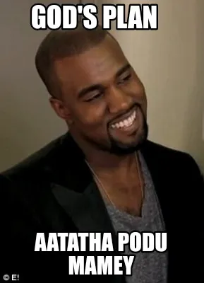 Make your own "Funny Aatatha podu mamey God's plan" meme with MemeCreator's free online meme generator. Add text, stickers, and drawings — then download or share. No watermark, no sign-up required.
