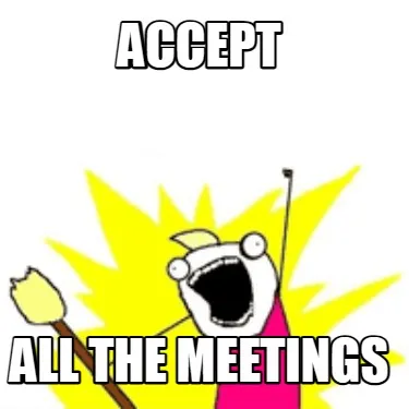 Make your own "ACCEPT ALL THE MEETINGS" meme with MemeCreator's free online meme generator. Add text, stickers, and drawings — then download or share. No watermark, no sign-up required.