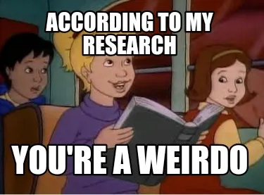 Make your own "According to my research You're a weirdo" meme with MemeCreator's free online meme generator. Add text, stickers, and drawings — then download or share. No watermark, no sign-up required.