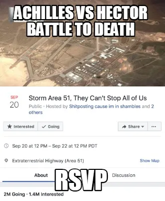 Make your own "Funny achilles vs hector battle to death rsvp" meme with MemeCreator's free online meme generator. Add text, stickers, and drawings — then download or share. No watermark, no sign-up required.