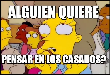 Make your own "Alguien quiere Pensar en los casados?" meme with MemeCreator's free online meme generator. Add text, stickers, and drawings — then download or share. No watermark, no sign-up required.