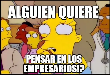 Make your own "Alguien quiere pensar en los empresarios!?" meme with MemeCreator's free online meme generator. Add text, stickers, and drawings — then download or share. No watermark, no sign-up required.