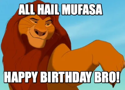 Make your own "All hail mufasa happy birthday bro!" meme with MemeCreator's free online meme generator. Add text, stickers, and drawings — then download or share. No watermark, no sign-up required.