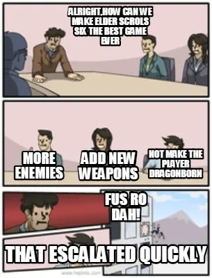 Alright,how can we make elder scrols six the best game ever fus ro dah! that esc Meme Template