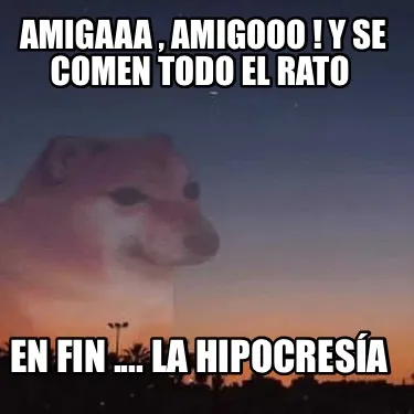 Make your own "Amigaaa , amigooo ! Y se comen todo el rato En fin .... la hipocresía" meme with MemeCreator's free online meme generator. Add text, stickers, and drawings — then download or share. No watermark, no sign-up required.