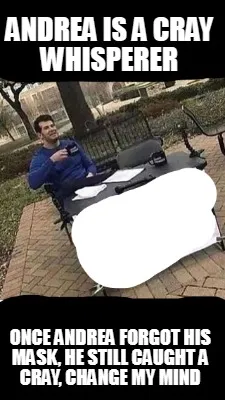Make your own "Andrea is a cray whisperer Once Andrea forgot his mask, he still caught a cray," meme with MemeCreator's free online meme generator. Add text, stickers, and drawings — then download or share. No watermark, no sign-up required.