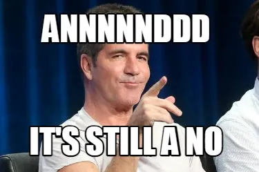 Make your own "Annnnnddd it's still a no" meme with MemeCreator's free online meme generator. Add text, stickers, and drawings — then download or share. No watermark, no sign-up required.