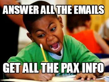 Make your own "Answer all the emails get all the pax info" meme with MemeCreator's free online meme generator. Add text, stickers, and drawings — then download or share. No watermark, no sign-up required.