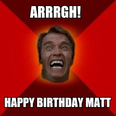 Make your own "Arrrgh! Happy Birthday Matt" meme with MemeCreator's free online meme generator. Add text, stickers, and drawings — then download or share. No watermark, no sign-up required.