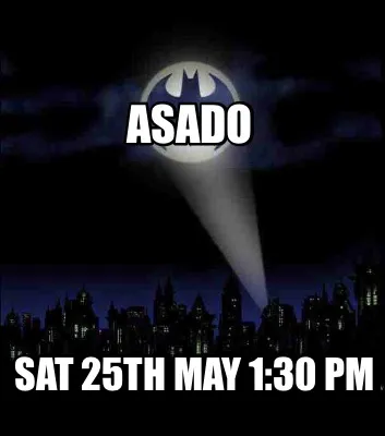 Make your own "Asado Sat 25th May 1:30 pm" meme with MemeCreator's free online meme generator. Add text, stickers, and drawings — then download or share. No watermark, no sign-up required.