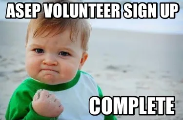 Make your own "ASEP Volunteer Sign Up Complete" meme with MemeCreator's free online meme generator. Add text, stickers, and drawings — then download or share. No watermark, no sign-up required.