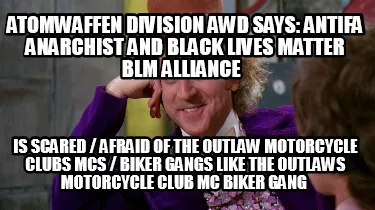 Make your own "Atomwaffen Division AWD says: Antifa Anarchist and Black Lives Matter BLM Allian" meme with MemeCreator's free online meme generator. Add text, stickers, and drawings — then download or share. No watermark, no sign-up required.