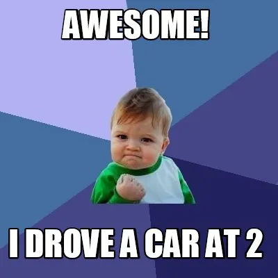 Make your own "Awesome! i drove a car at 2" meme with MemeCreator's free online meme generator. Add text, stickers, and drawings — then download or share. No watermark, no sign-up required.