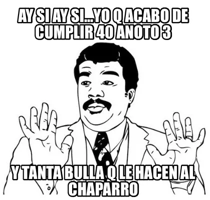 Make your own "Funny Ay si ay si...yo q acabo de cumplir 40 anoto 3 Y tanta bulla q le hacen al chapa" meme with MemeCreator's free online meme generator. Add text, stickers, and drawings — then download or share. No watermark, no sign-up required.