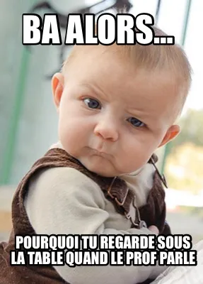 Make your own "Ba alors… Pourquoi tu regarde sous la table quand le prof parle" meme with MemeCreator's free online meme generator. Add text, stickers, and drawings — then download or share. No watermark, no sign-up required.