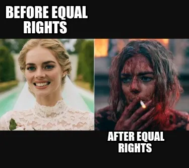 Make your own "Before equal rights After equal rights" meme with MemeCreator's free online meme generator. Add text, stickers, and drawings — then download or share. No watermark, no sign-up required.