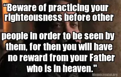 Make your own "Funny “Beware of practicing your righteousness before other people in order to be s" meme with MemeCreator's free online meme generator. Add text, stickers, and drawings — then download or share. No watermark, no sign-up required.