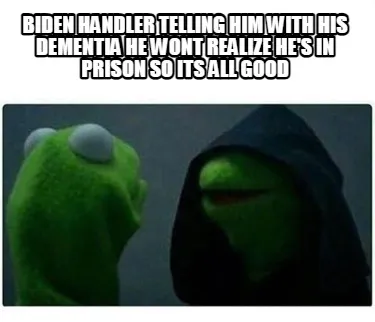 Create Funny biden handler telling him with his dementia he wont realize he's in prison so it Meme