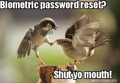Make your own "Biometric password reset? Shut yo mouth!" meme with MemeCreator's free online meme generator. Add text, stickers, and drawings — then download or share. No watermark, no sign-up required.