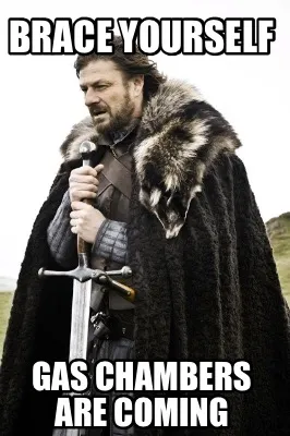 Make your own "Brace yourself Gas chambers are coming" meme with MemeCreator's free online meme generator. Add text, stickers, and drawings — then download or share. No watermark, no sign-up required.