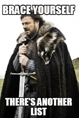 Make your own "Brace Yourself there's another list" meme with MemeCreator's free online meme generator. Add text, stickers, and drawings — then download or share. No watermark, no sign-up required.