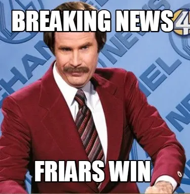Make your own "Breaking NEWS FRIARS WIN" meme with MemeCreator's free online meme generator. Add text, stickers, and drawings — then download or share. No watermark, no sign-up required.