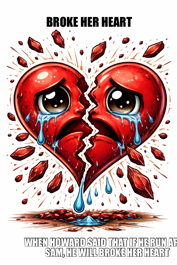 Make your own "BROKE HER HEART — WHEN HOWARD SAID THAT IF HE RUN AFTER SAM, HE WILL BROKE HER HEART" meme with MemeCreator's free online meme generator. Add text, stickers, and drawings — then download or share. No watermark, no sign-up required.