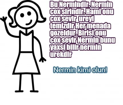 Make your own "Bu Nermindir. Nermin cox sirindir. Hami onu cox sevir ureyi temizdir Her menada" meme with MemeCreator's free online meme generator. Add text, stickers, and drawings — then download or share. No watermark, no sign-up required.