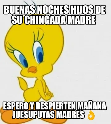 Make your own "Buenas noches hijos de su chingada madre Espero y despierten mañana juesuputas" meme with MemeCreator's free online meme generator. Add text, stickers, and drawings — then download or share. No watermark, no sign-up required.